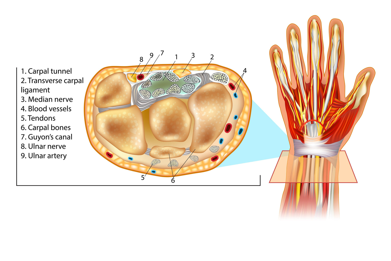 The grip is comprised of a group of small finger flexor muscles in the forearm. These finger flexor muscles (see diagram) are connected to the fingers by tendons passing through the wrists. Also running through the wrists are arteries for blood flow, and nerves. These small finger flexor muscles allow the hands to hold onto and carry the weight on the weightlifting bar. In order to gain maximum development and isolation of the larger muscles in the body - such as the back, arms, and chest - the grip and hands need to be protected and supported.